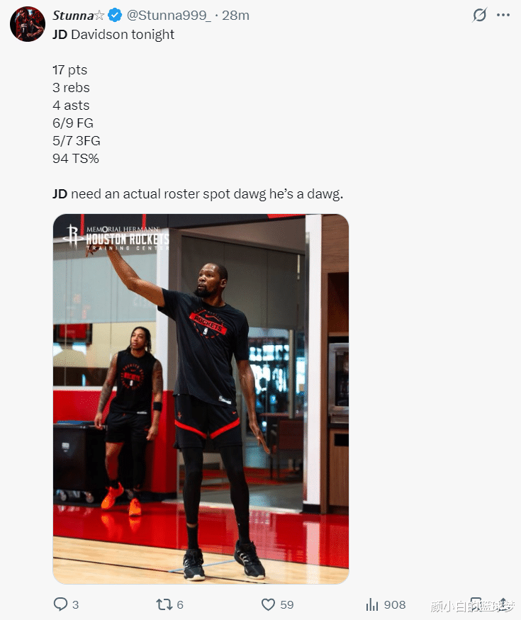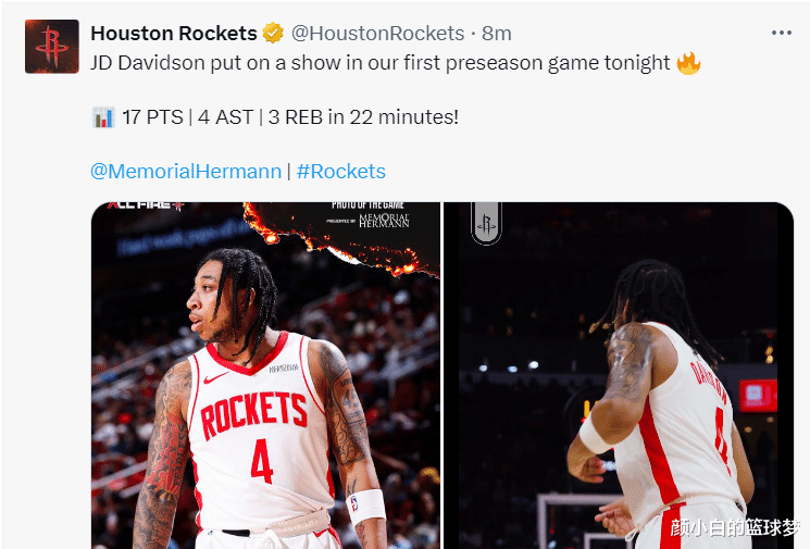 Rockets official: JD-Davidson's season debut for the Rockets was excellent, scoring 17+5 three-pointers in 22 minutes.