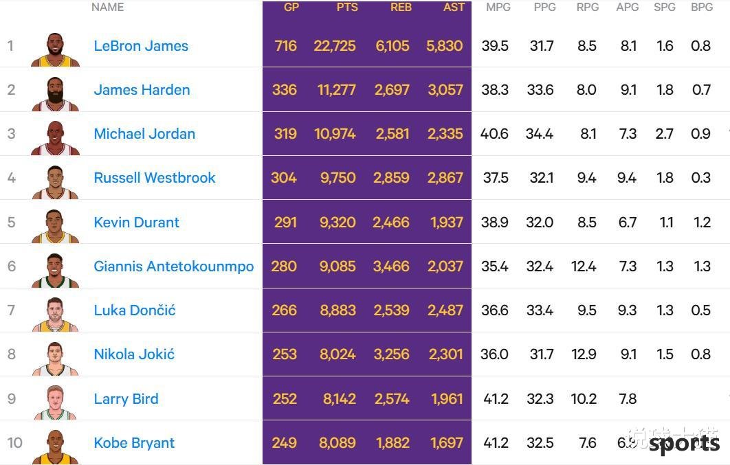 At present, only 15 players in NBA history have averaged 25.0 points per game in their careers, including Kobe 24.99 points, Curry 24.74 points, and Harden 24.05 points! Of course, all three were greatly affected by the early tactical status and injuries.