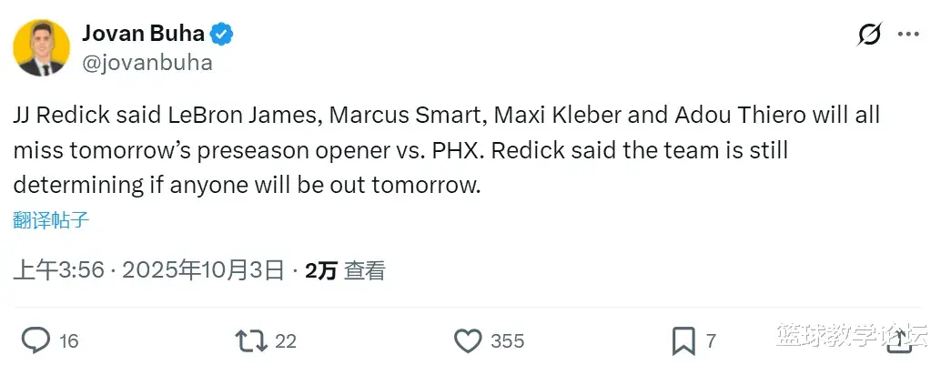 On October 3, the Lakers officially announced that James (hip), Smart (Achilles tendonitis), Cleber (quadriceps) and Adu Tiero (knee) will miss tomorrow's preseason game with the Suns. Jaylen Green had a mild hamstring strain and could not be beaten. Three days ago, Cleber said that he had recovered 100% of his health, but now he is injured again.