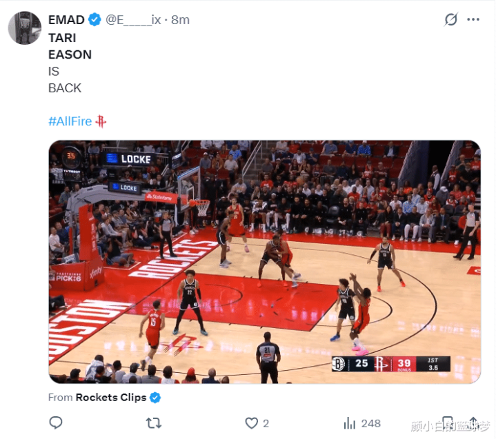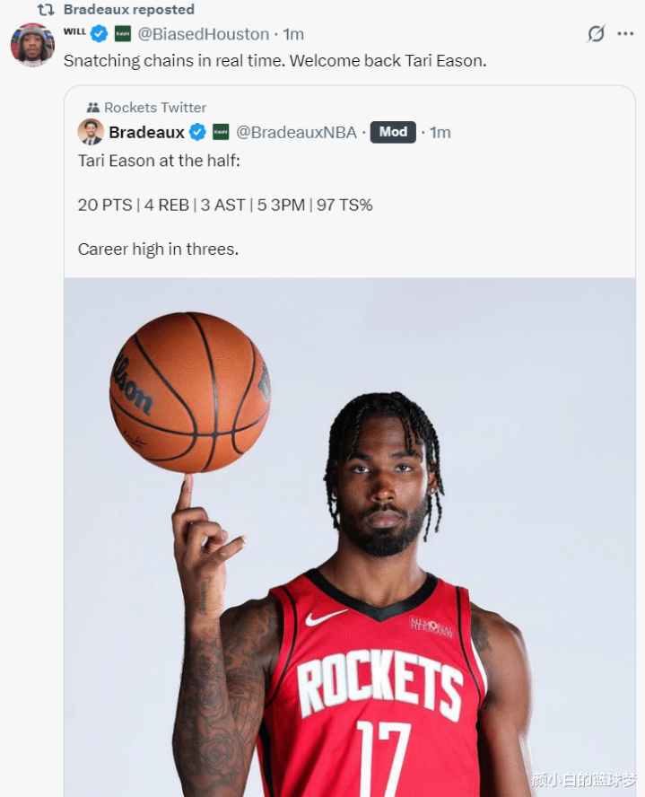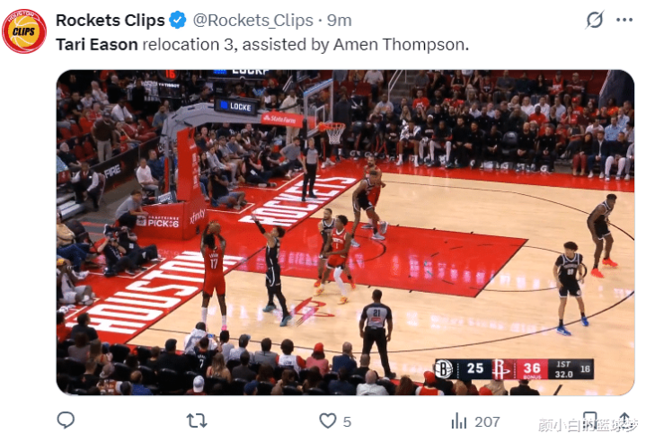 October 28, NBA regular season, Rockets VS Nets. In the first half, the Rockets' Ethan had a super explosion. He hit 5 three-pointers in the half, setting a career high in a single game. He also scored 20 points, 4 rebounds and 3 assists in just 14 minutes and 33 seconds. He made the media go crazy.