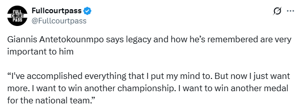 Speaking of the goals of the new season, Antetokounmpo said: I am eager to win another championship and to win another medal for my country. Just like every basketball player and every athlete, I will have pursuits when starting my career, what kind of achievements I want to achieve, and how I hope to be remembered. At this moment I think I have achieved all the set goals, but now I want more - to win another championship and win another medal for the national team, because inheritance means a lot to me.