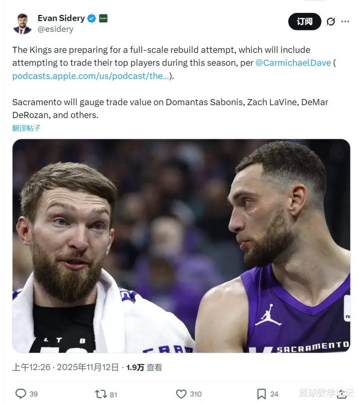 On November 12, according to Forbes sports reporter Evan Sidery, the Kings are preparing to rebuild and are evaluating the trade value of Savoy, LaVine, DeRozan and others. As of today's pre-game, the Kings have 3 wins and 7 losses and are only ranked 11th in the Western Conference. And Savoy is also dissatisfied with the current situation of the Kings. He publicly criticized the team's defense for being too poor.