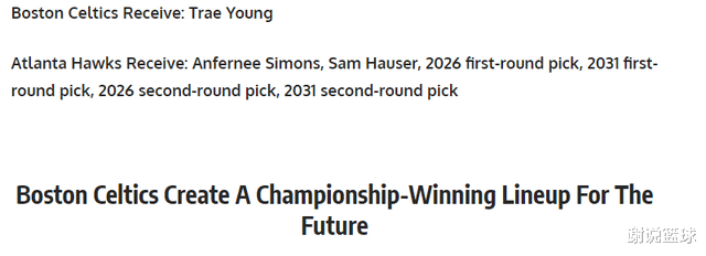 Of course, both the Celtics and Tatum hope to hit the highest stage again, so the media FW supported the Green Army and traded guard Trae Young from the Hawks. Among them, the Celtics sent away two rotations, Anfernee Simons and Sam Hauser to the Hawks, and then gave away multiple draft picks, including first-round picks in 2026 and 2031. This price is a bit high.
