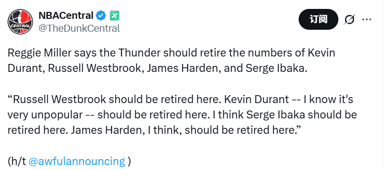 Miller suggested that the Thunder retire the jerseys of four players! US media questioned Harden s qualifications: He should be useless after only playing 7 starts.