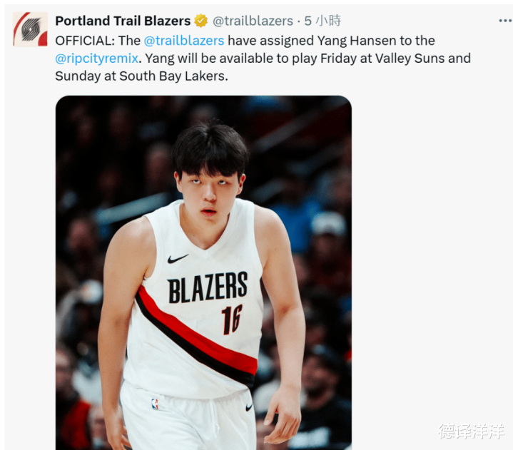 Heavy news came from the NBA today: The Portland Trail Blazers sent Yang Hansen to the NBA Development League for the third time, and he still joined the Tearing City Mixed Team.