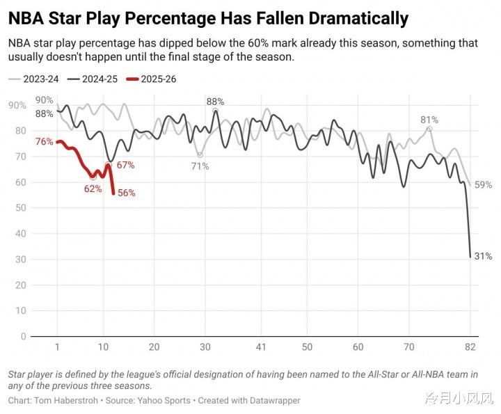 Today, according to statistical reports by reporter Tom Haberstroh, stars (players who have been selected to the All-Star or Best Team in the past three seasons) have been absent from more than 200 games so far this season, and the attendance rate has dropped below 60%, only 56%. It is worth mentioning that the attendance rate during the same period last year was 67%, while the attendance rate the year before last was 87%. According to statistics, a total of 45 players meet the definition of a star this season, which means that on average each star will miss at least five games. Even excluding those stars who have long been out for a long time due to serious injuries (such as Irving, Tatum and others who have undergone surgery), the attendance rate of the stars is only 75%.