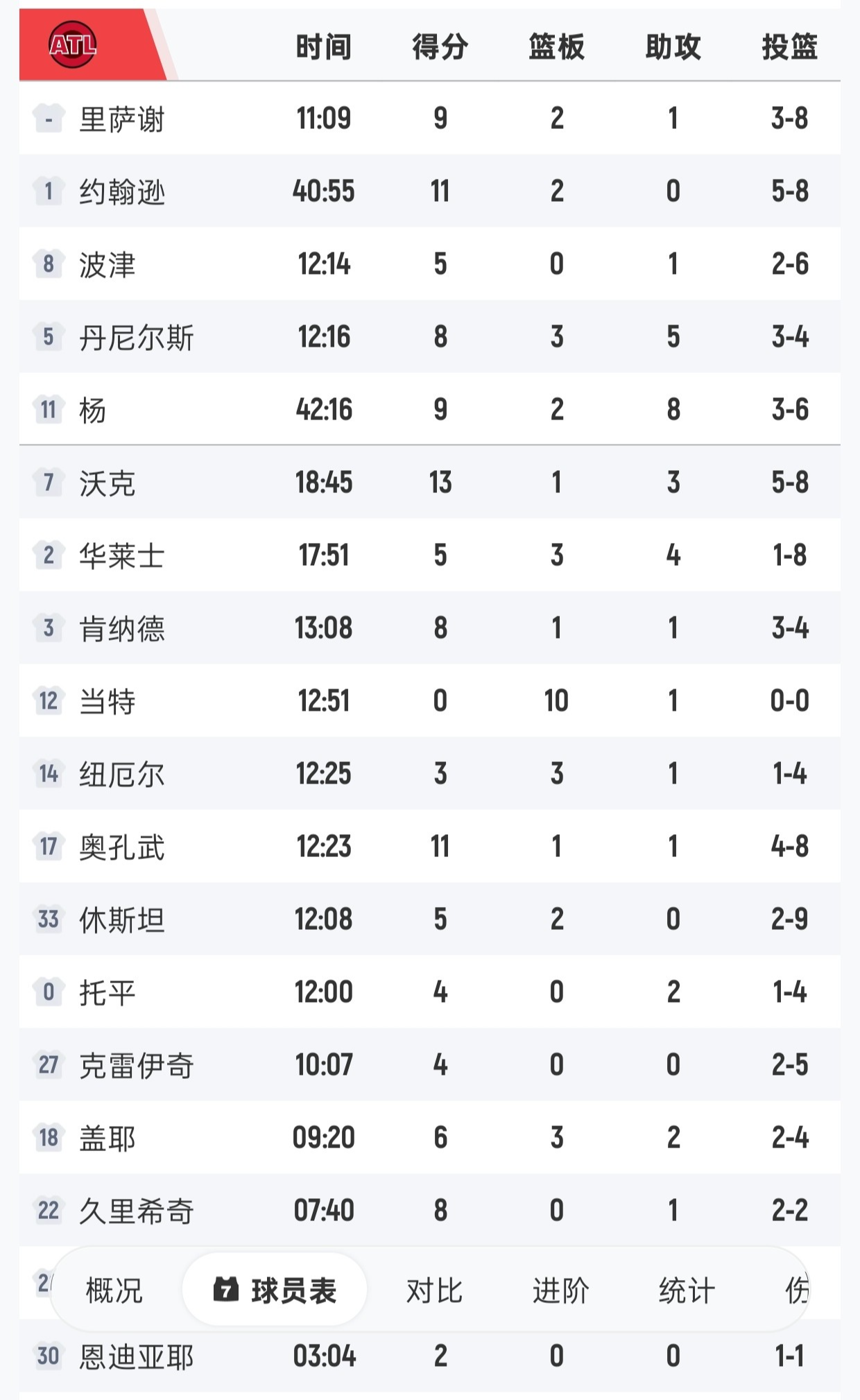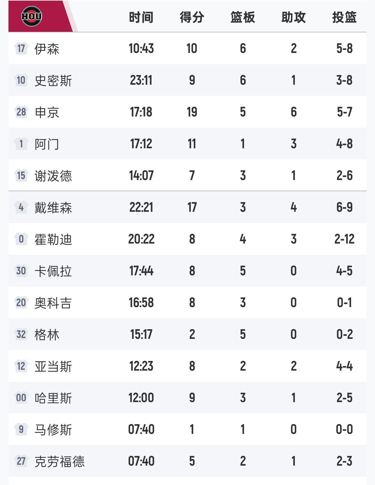 Shen Jing, the Rockets, performed well in the first half, scored 19 points, 5 rebounds and 6 assists, Smith also performed well, contributed 8 points, 3 rebounds and 1 assist, and Shepard scored 7 points and 3 rebounds. Walker performed well in the Hawks and scored 10 points and 2 assists, Okonggu performed well and scored 11 points, Trae Young scored 9 points and 7 assists, and Johnson also performed well and scored 11 points.