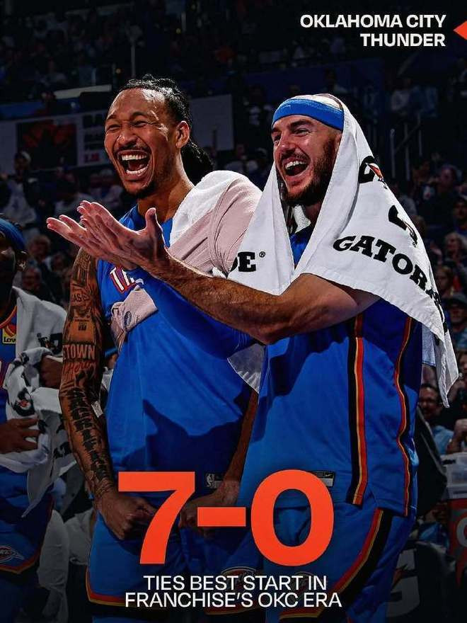 Moving forward, the Thunder continued to defeat the Hawks, Mavericks, Kings, Wizards and Pelicans, thus becoming the only team to maintain a winning record so far in the new season. The Thunder started with seven consecutive wins for two consecutive seasons, becoming the third team in history to achieve this point.
