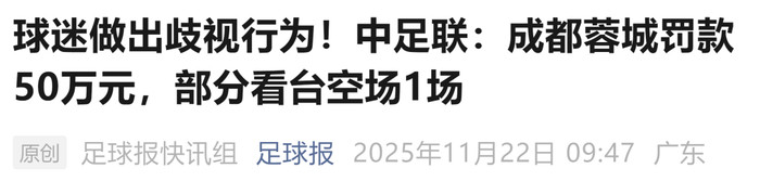 Bad impact! Chinese Football Federation fines 500,000 yuan