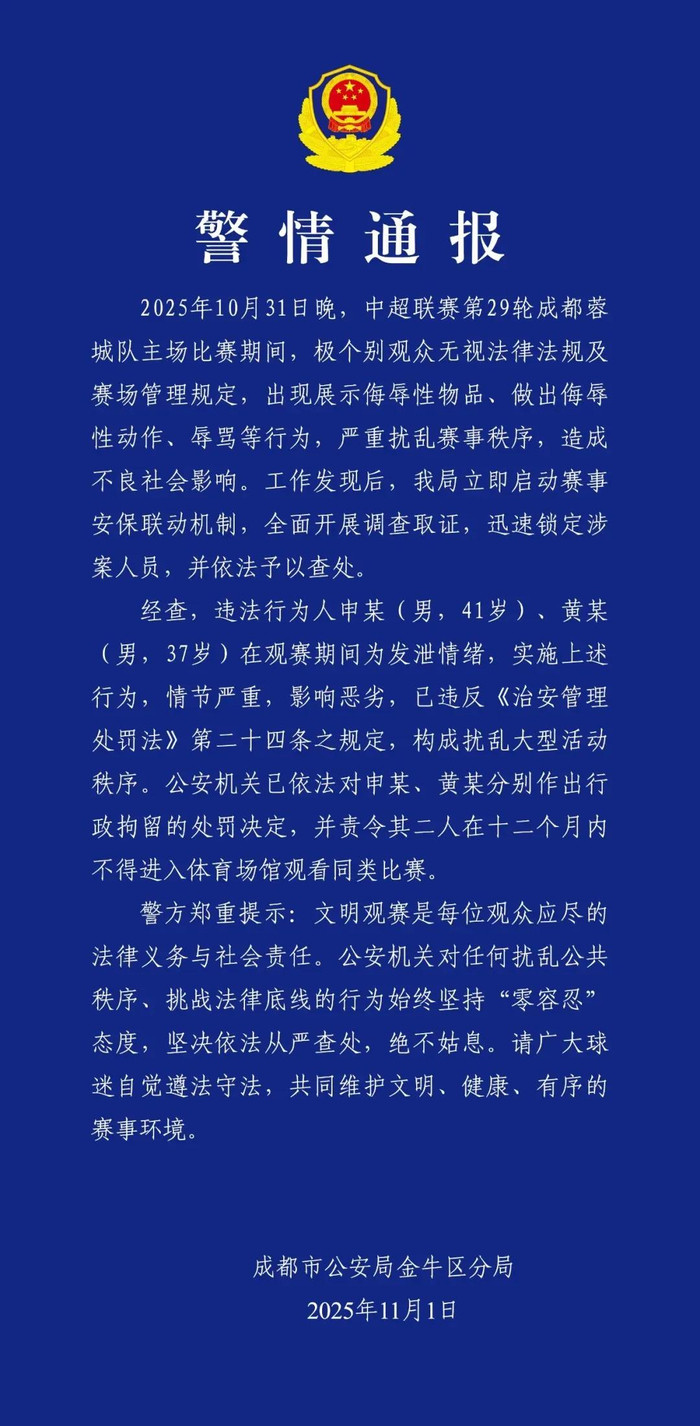Previously, the Jinniu District Branch of the Chengdu Municipal Public Security Bureau issued a police information report on November 1. The illegal perpetrators Shen (male, 41 years old) and Huang (male, 37 years old) have been punished with administrative detention in accordance with the law, and they were ordered not to enter sports venues to watch similar games within 12 months.