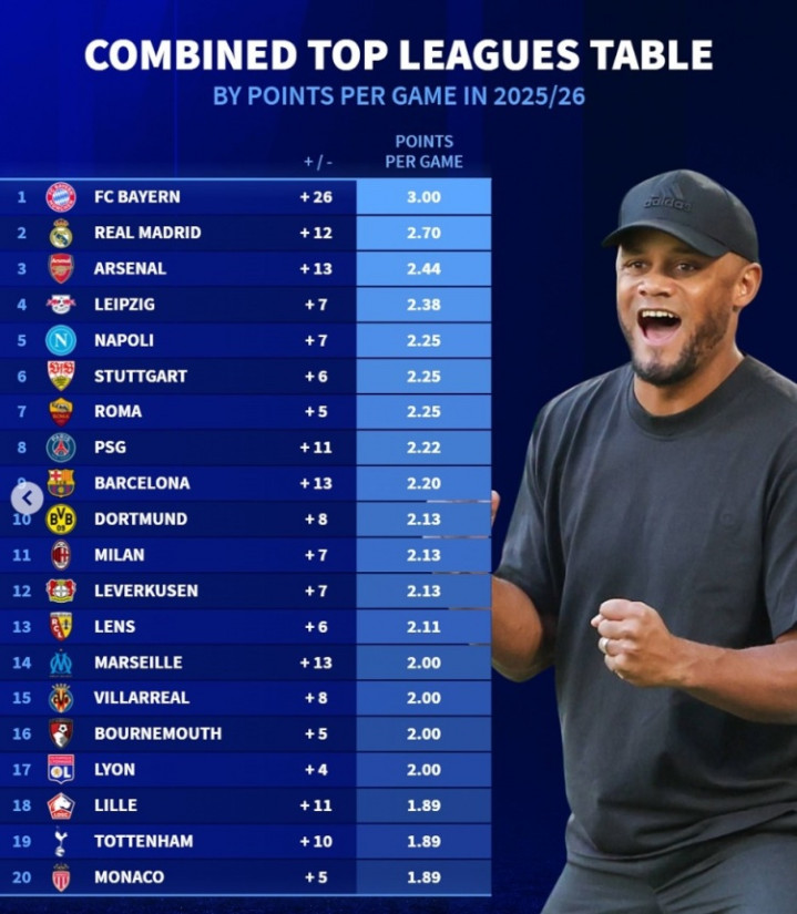 On October 28th, "Transfer Market" updated the average points per game of the five major league teams this season. Bayern, Real Madrid, and Arsenal ranked among the top three.