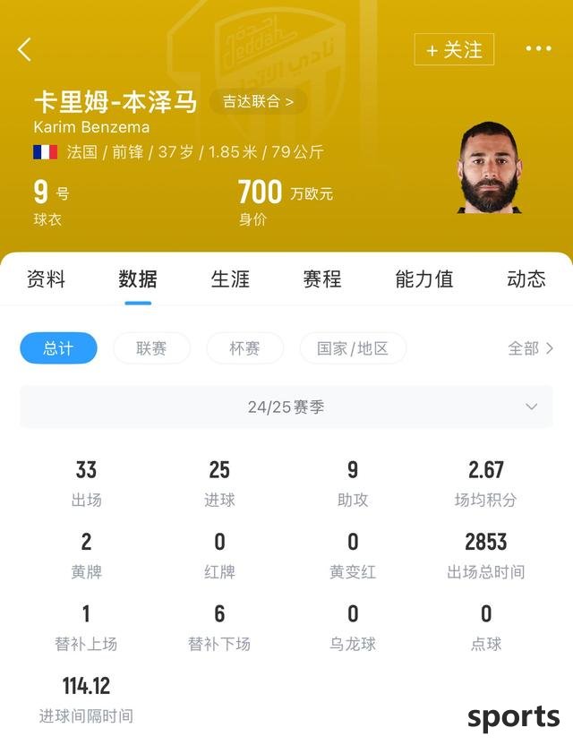 But in the second year, Benzema played 33 games for Jeddah United and scored 25 goals and 9 assists, including Saudi United in 29 games, 21 goals and 9 assists, and Sand Crown in 4 games, helping the team win the league championship and cup championship, and he also won the Saudi League season MVP.