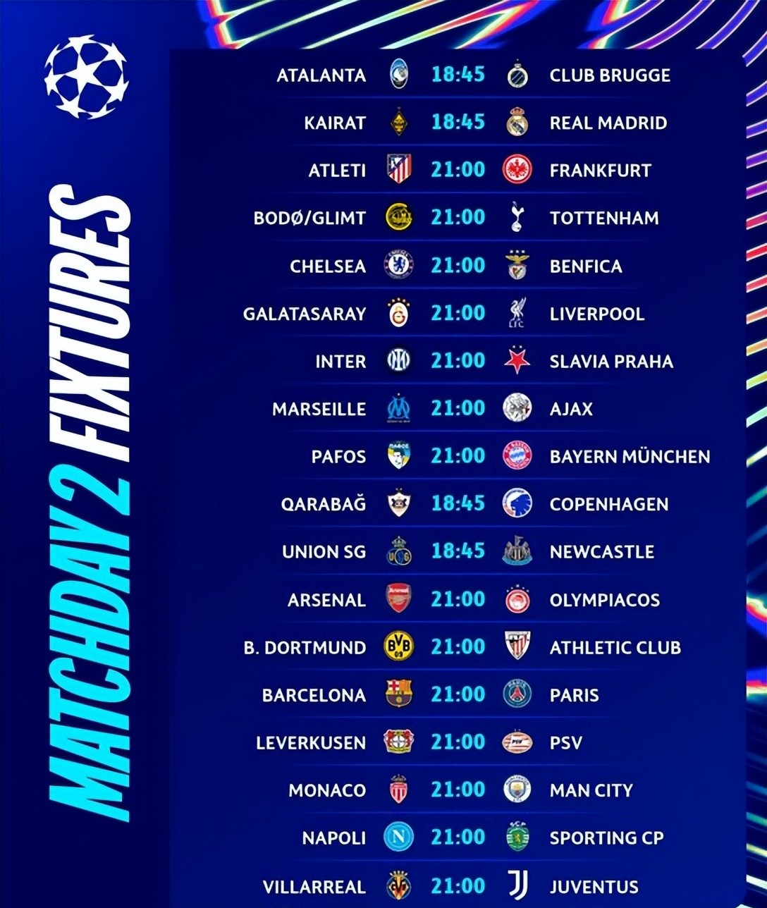 Starting at 00:45 on October 1, the second round of the UEFA Champions League stage of the 2025-2026 season will be fully played two days before the National Day holiday. In this round of events, Atletico Madrid vs Frankfurt, Chelsea vs Benfica, Barcelona vs Paris and other focus events will inevitably increase the attention of the Champions League during the National Day holiday.