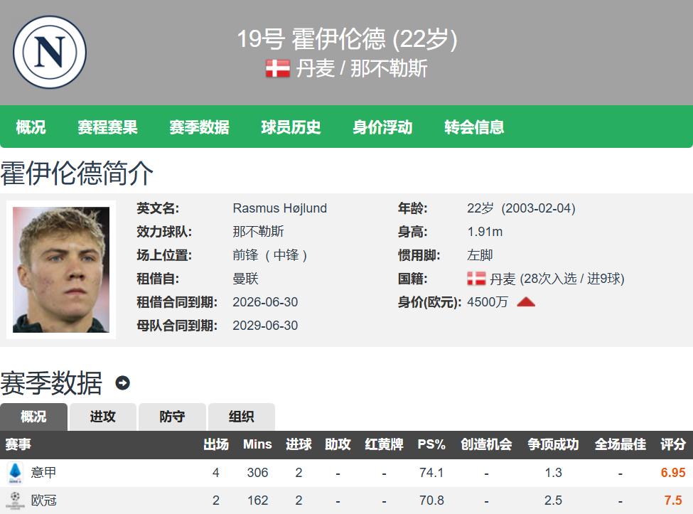 In sharp contrast to Zirkzee is the 22-year-old Hoylen, who is not wanted by Manchester United. He immediately returned to Serie A on loan this summer to join the defending champion Naples. He has made 6 appearances so far this season, all starts. He scored 2 goals in 4 Serie A games, 2 goals in 2 Champions League games, and a total of 4 goals in 6 games. He is very efficient, as if he has suddenly regained his confidence and regained his scoring form. It's really like moving a tree to move a dead person to move a living person!