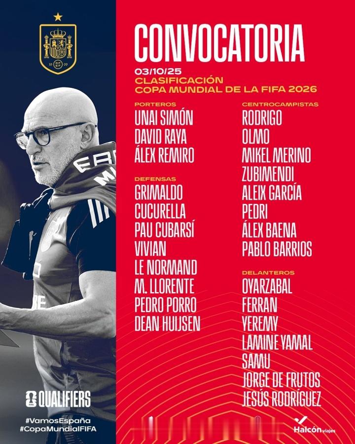 October 3rd News Spain officially announced the list of players who will go to the World Cup in October, with Barcelona players such as Yamal and Pedri being selected.