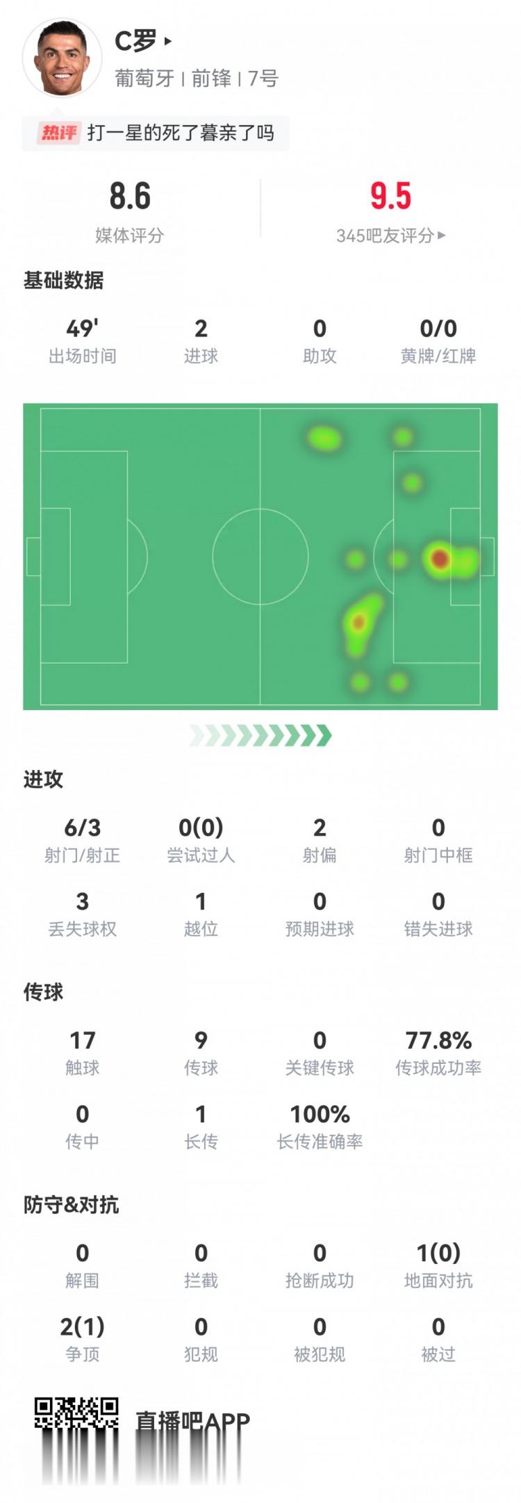 Exclusively the top scorer in the history of the World Preliminaries! Cristiano Ronaldo s half-time statistics: 6 shots, 3 goals and two goals, with a rating of 8.6