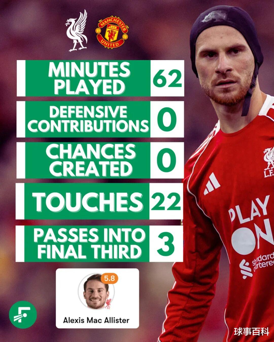 But in the 2025/26 season, McAllister's performance is like sleepwalking. Against Manchester United, he played more than 62 minutes, touching the ball only 22 times, passing the ball 13 times, and losing the ball 6 times - for a central midfielder, the numbers are shocking. What's even more astonishing is that he succeeded in 0 confrontations and quickly became the target of public criticism. A Liverpool blogger bluntly stated on X that he is "the most overrated player in the team" and "is as slow as a 40-year-old player from penalty area to penalty area."