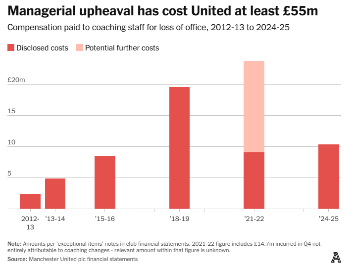 Manchester United has spent nearly 60 million to change coaches after Freud retired; the cost of firing Amorin is high