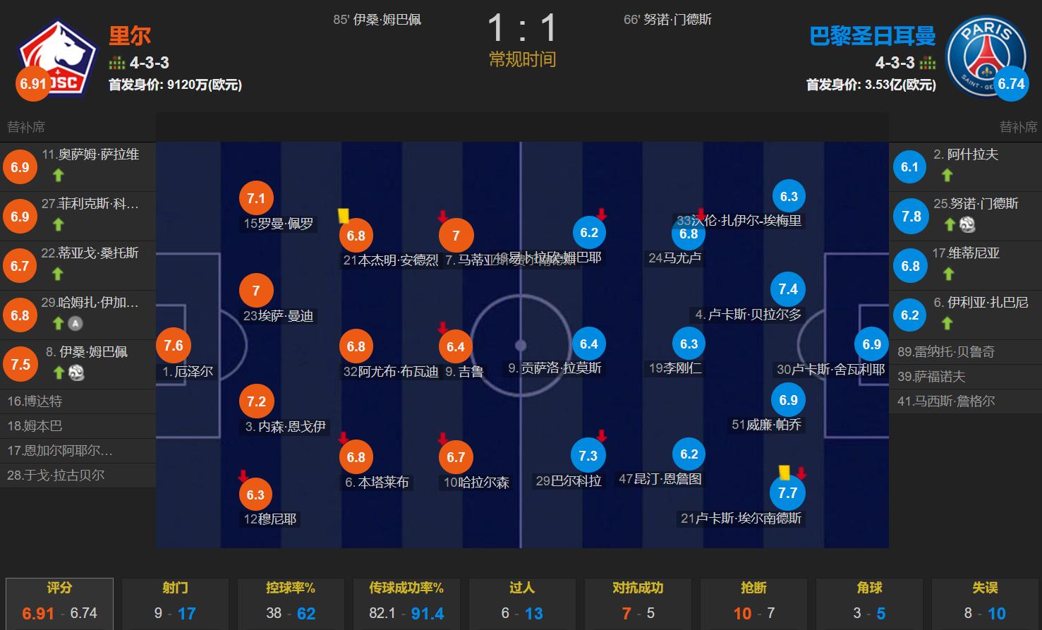 In the end, Lille 1-1 Paris, and the two teams scored one point. Although Paris is still ranked first in the Ligue 1 standings, it is only 1 point ahead of Marseille; Lille ranks seventh.