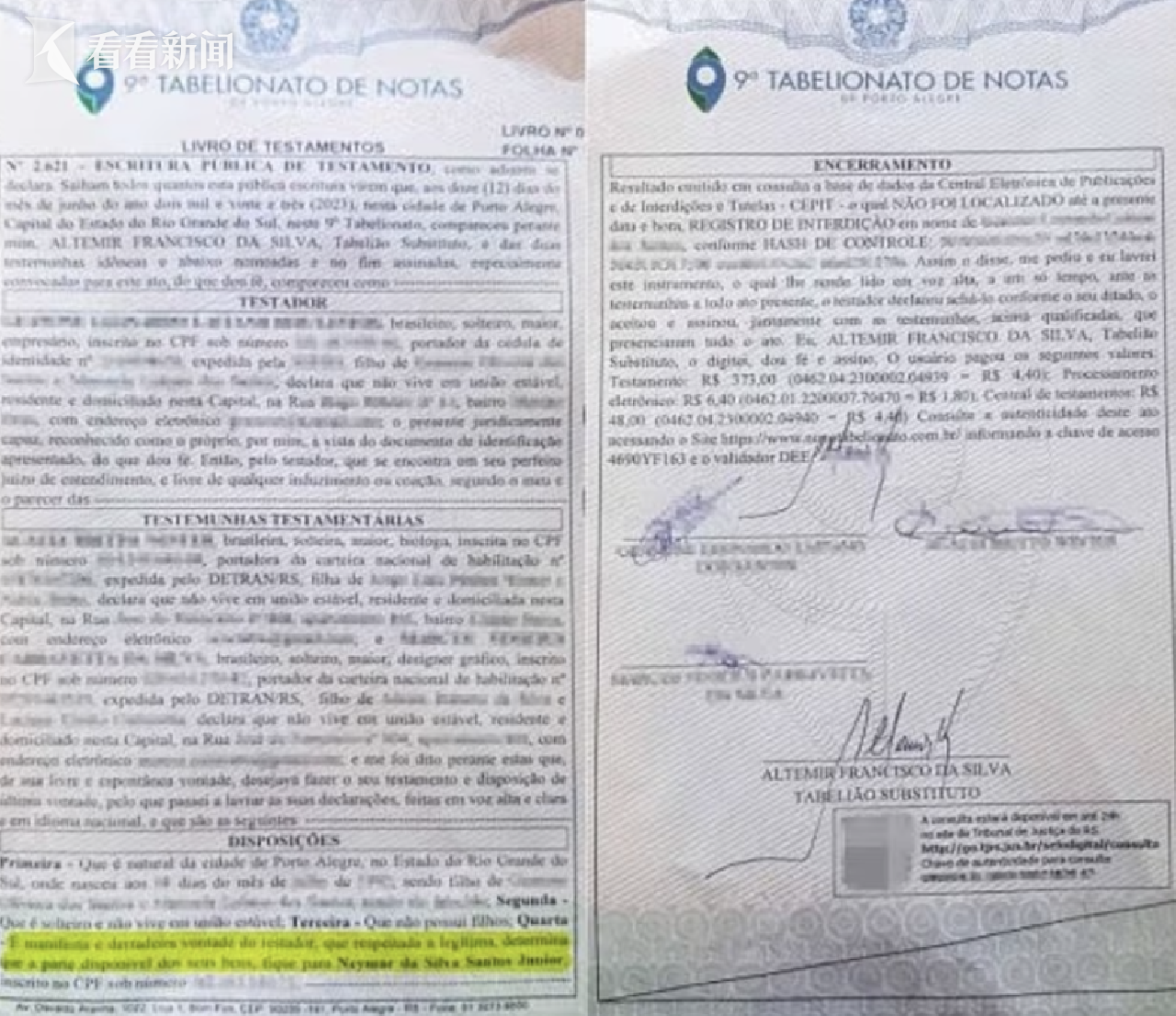 The will was formally signed on June 12 at a notary office in Porto Alegre, Brazil, with two witnesses present. At present, the will still need to be approved by the Brazilian court before Neymar can be officially confirmed as the heir. According to British media reports, the unnamed rich man has passed away, has no children and is single.