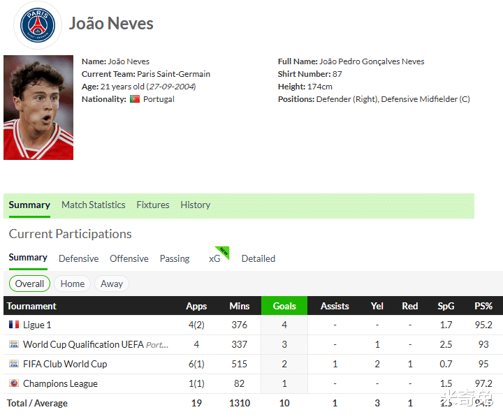 In Paris Saint-Germain, the team's advantages lie in its strong running ability, high speed, and fast transition between offense and defense. However, when Fabian Ruiz often needs to penetrate the opponent's penalty area, Paris will rely heavily on Neves' help on the defensive end.