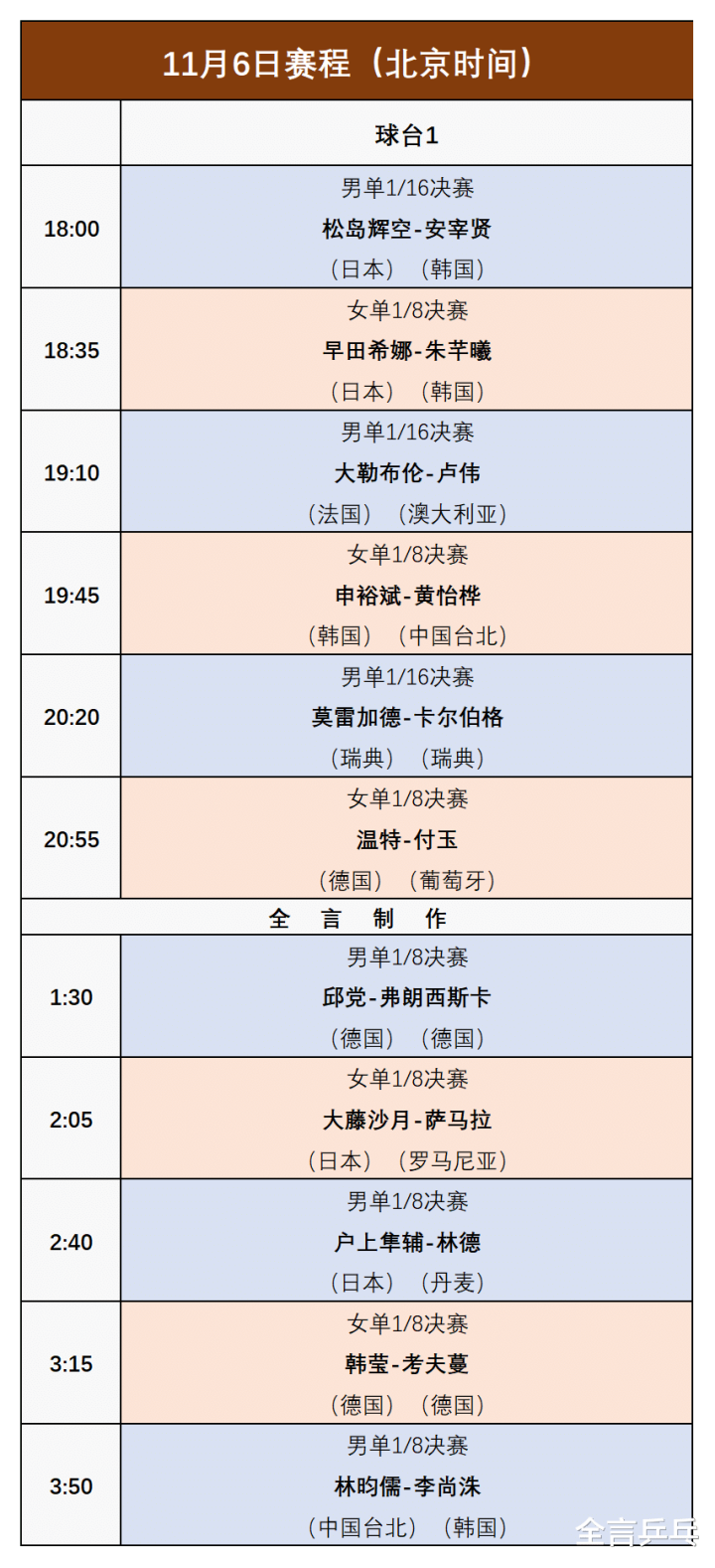 According to the arrangement, the last 6 singles 1/16 finals will continue on the evening of November 6th. The detailed schedule is: