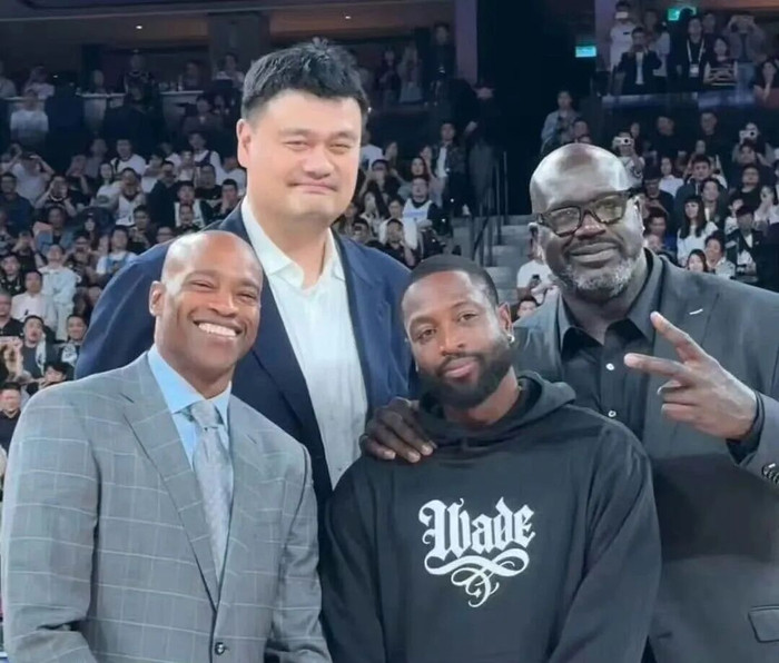Two legendary NBA superstars, Yao Ming and O'Neal, watched the game together from the sidelines.